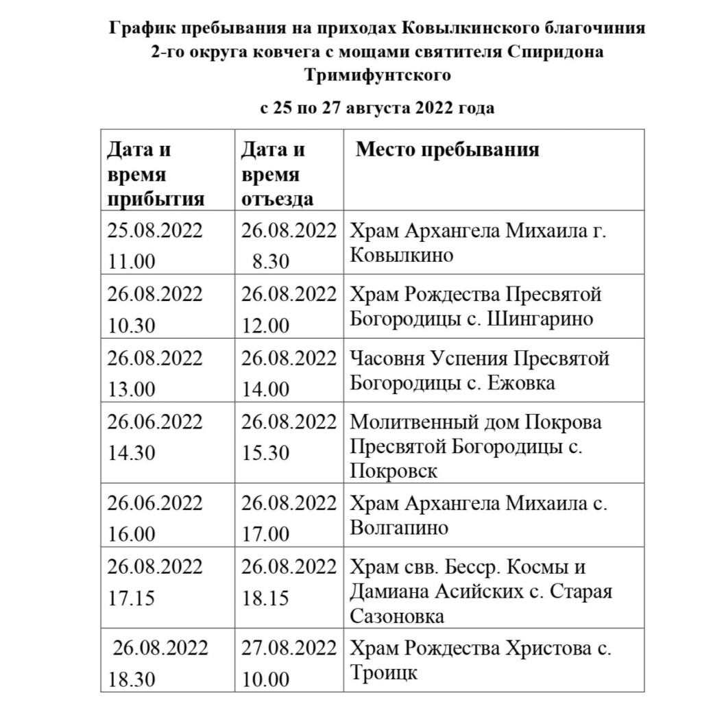 Публикуем график и маршрут пребывания ковчега со святыми мощами святителя Спиридона, Тримифунтского чудотворца в Ковылкинском благочинии 2-го округа.