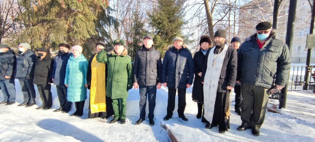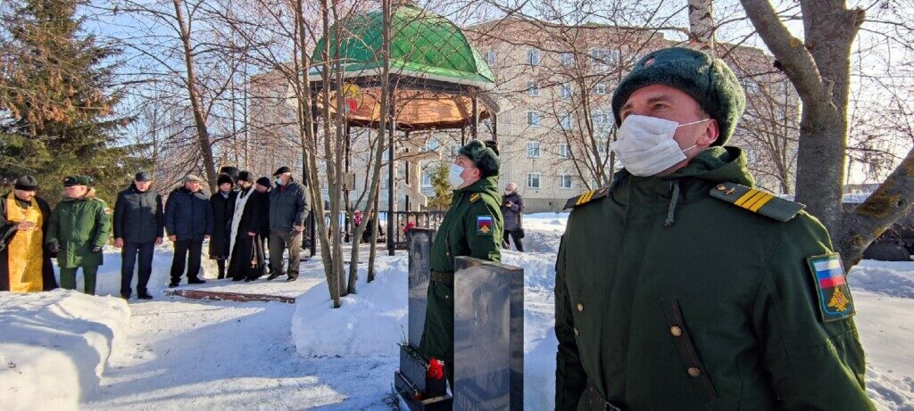 Память военнослужащих, отдавших жизни при исполнении долга, почтили минутой молчания, после чего к поклонному кресту в часовне и у подножья мемориальных плит с именами и портретами погибших воинов-земляков возложили цветы.