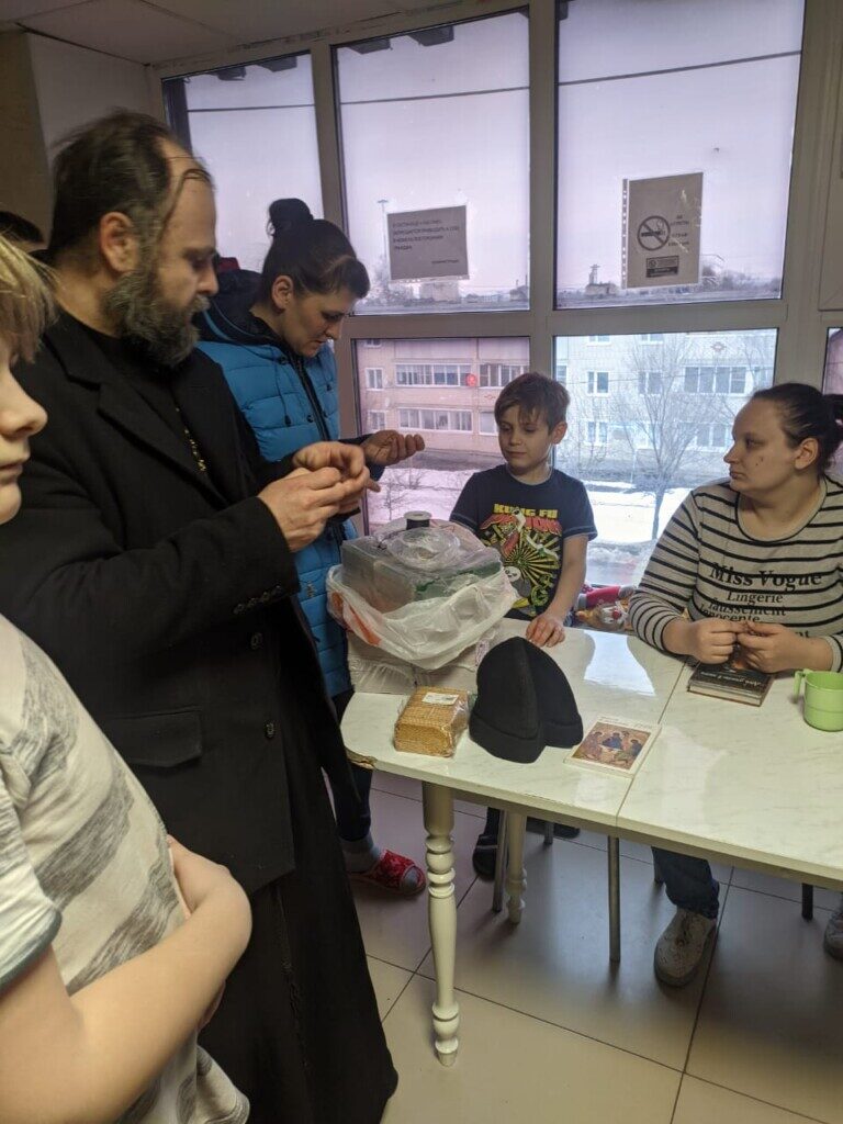 Каждый пункт временного размещения окормляется священником. Налажена связь с оперштабом по приему пожертвования для беженцев. Были розданы Евангелия, детские библии, молитвословы, все нуждающиеся получили крестики и гайтаны. Организованна, небольшая библиотека . Связь со священником осуществляется не только при личном общении, но по телефонной связи.