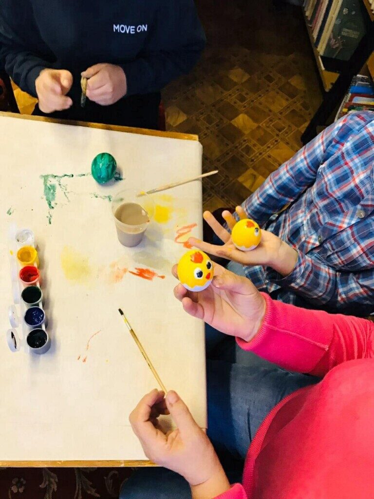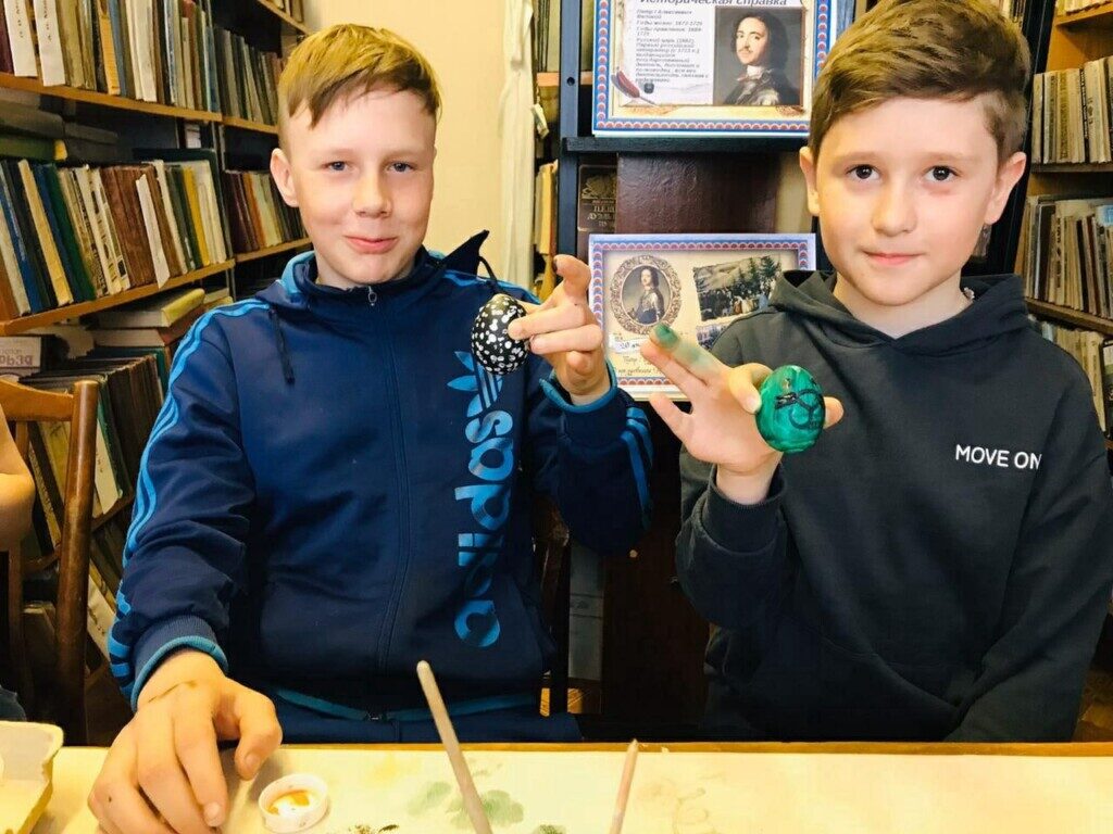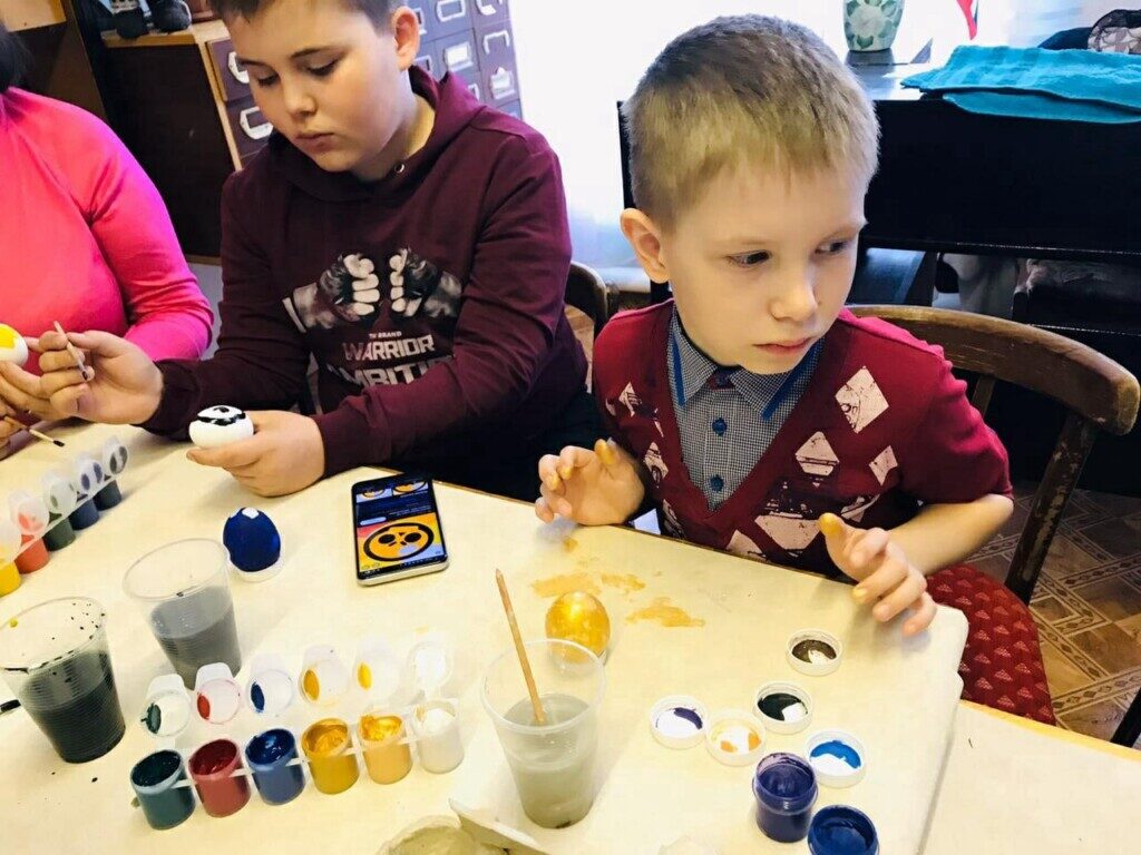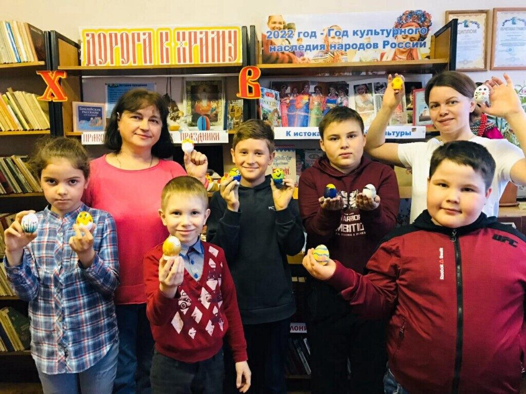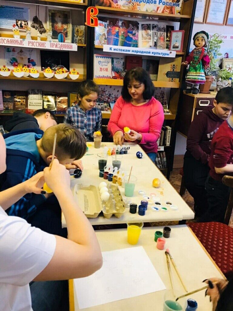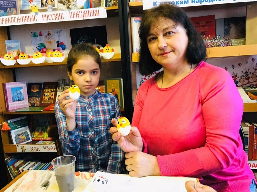 В Приходе Крестовоздвиженской церкви села Русская Лашма Ковылкинского благочиния 2-го округа руководитель клуба Кулагина Мария и руководитель библиотеки Нагаева Вера собрали детей для раскрашивания яиц в преддверии праздника Святой Пасхи.